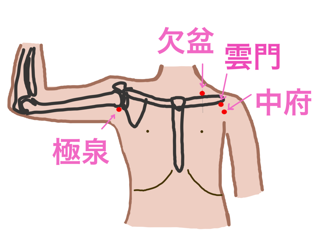 鎖骨の外端の下から指2本分下がったところにあります。