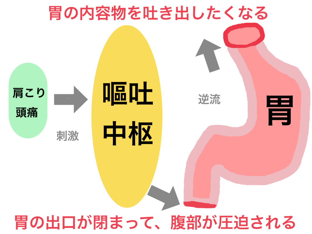 とくに肩こりがひどく頭痛が起きているときに、その刺激が嘔吐中枢に影響をうけているからです。