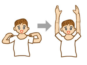 (2)そのまま肩甲骨を動かすような意識でバンザイするように上に上げます。